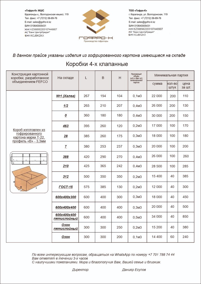 За счет удобства раскроя и технологической простоты производства, гофроящик четырехклапанный является самым недорогим видом упаковки. Он отлично подходит для упаковки продукции пищевой промышленности, например, при производстве кондитерских изделий, мясомолочных продуктов, различных полуфабрикатов, алкогольных и безалкогольных напитков и прочих.